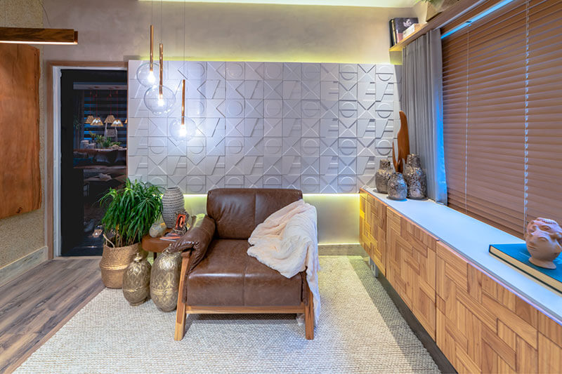 Composta de lâminas em alumínio 25mm e 50mm em alumínio, madeira, madeira sintética e PVC
